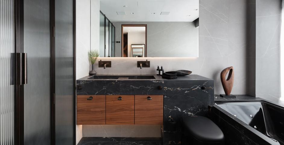 Finishes were chosen to complement the overall look - Green Guatemala and Black Portoro marble was paired with our signature dark bronze waxed finish.
