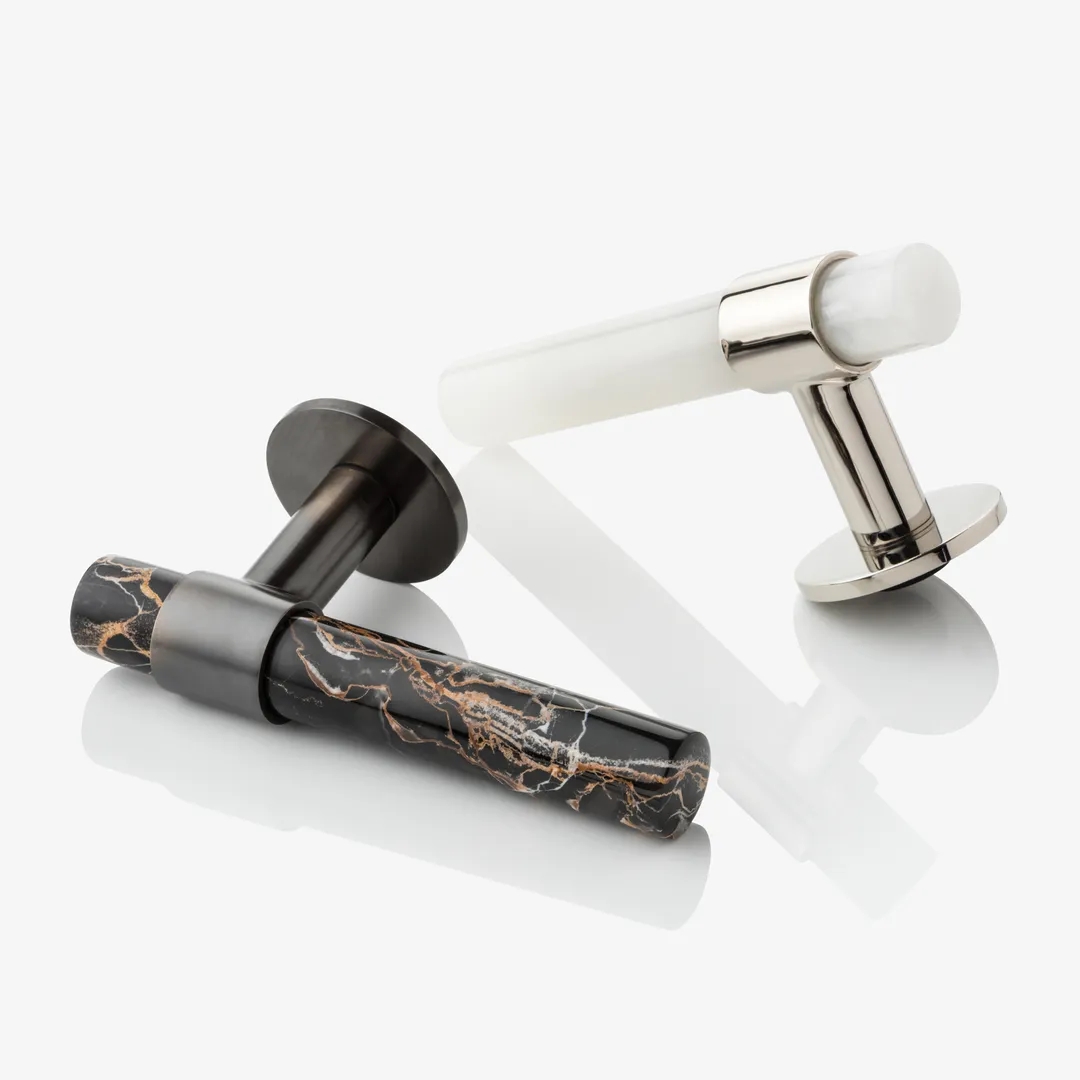 The sleek, carefully coordinated design scheme was enhanced by our stunning Collett brass & marble lever handles and door pulls.