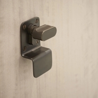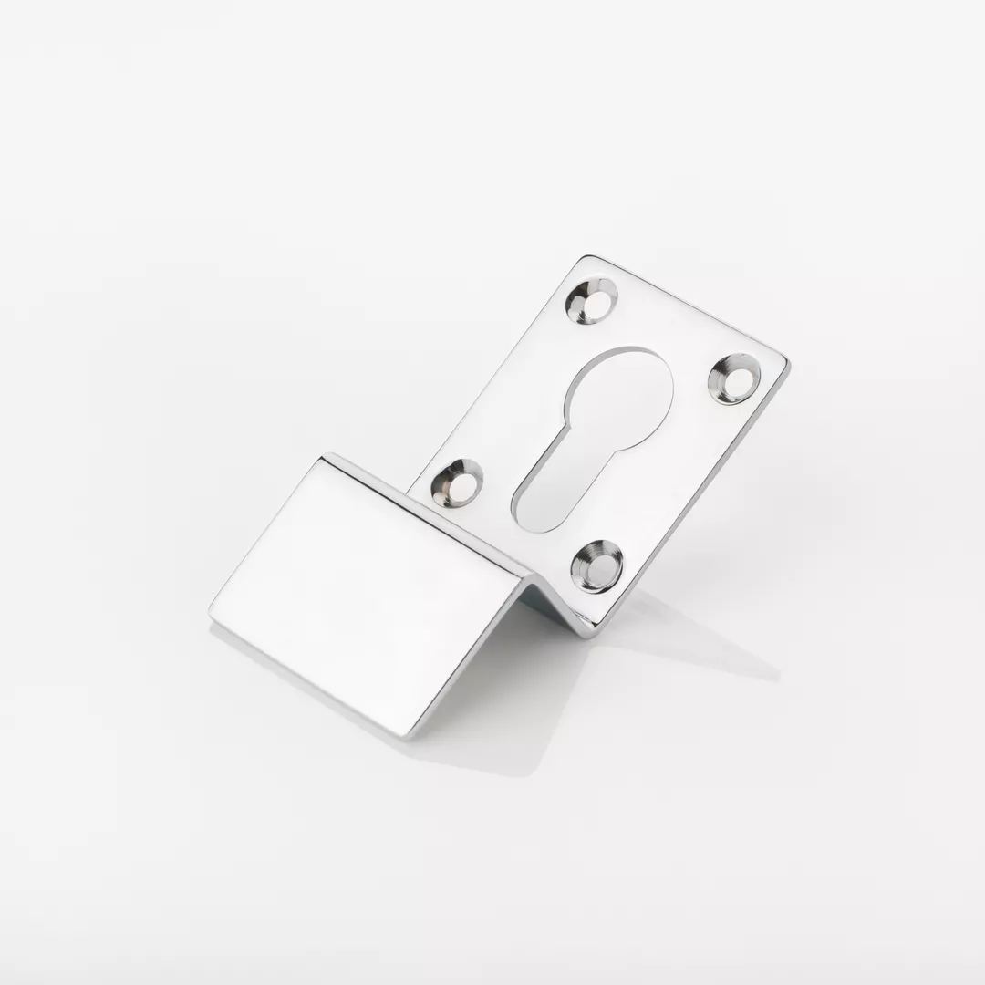A solid brass escutcheon plate that shrouds a euro cylinder to protect the door and also acts as a discrete door pull.