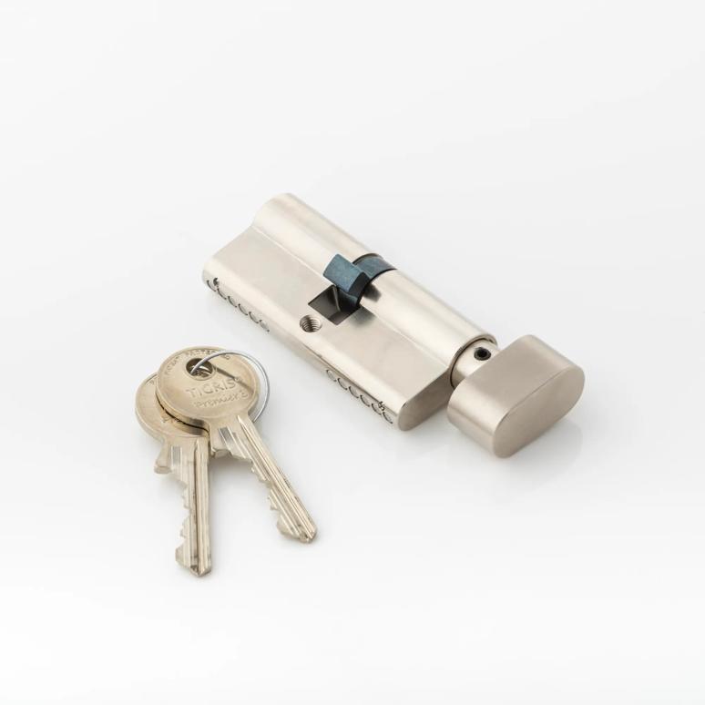 Solid brass euro profile cylinder with five internal pins: each cylinder is pinned, built, and finished by hand. Operated by a key on one side and a thumb turn on the other side.